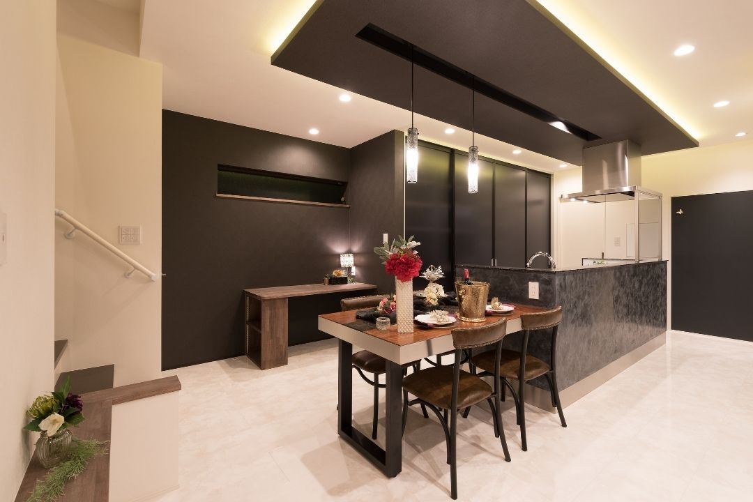 昼とは違った表情を見せる夜のリビングは、ダウンライトがムードある極上の空間を演出。