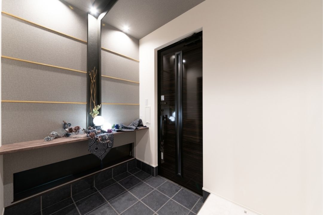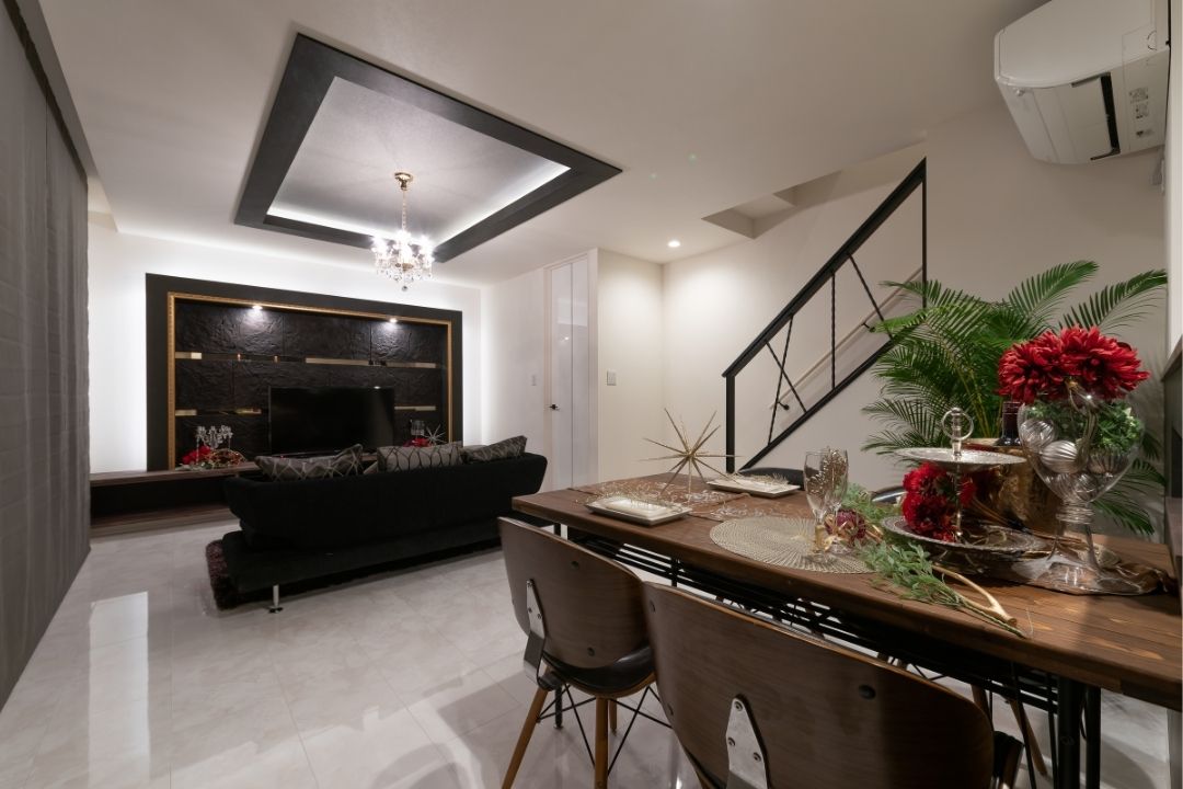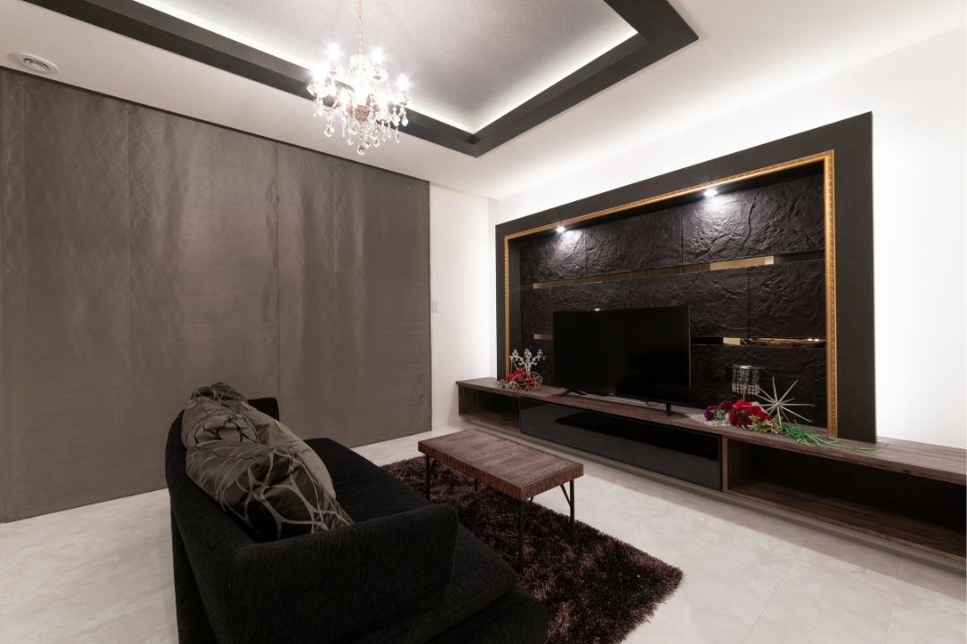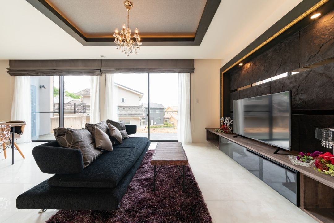 白を基調としたリビングに、凹凸感のある造作テレビボードとゴールドラインが空間を締める。