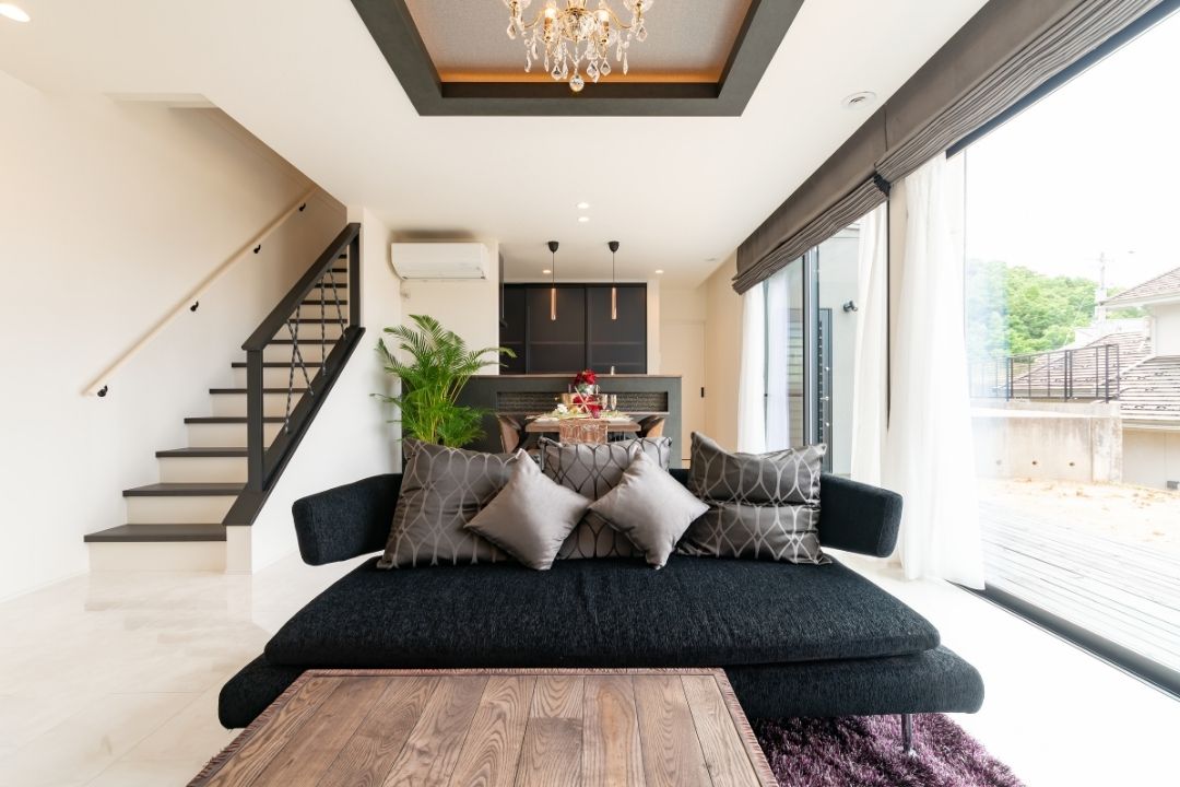 大きな窓から差し込む光をタイルが優しく反射させ、明るいリビングに。